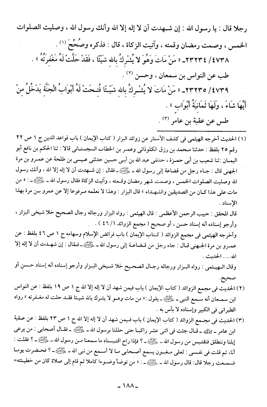 (¬1) الحديث أخرجه الهيثمي في كشف الأستار عن زوائد البزار (كتاب الإيمان) باب قواعد الدين ج 1 ص 22 رقم 25 بلفظ: حدثنا محمد بن رزق الكلوذانى وعمر بن الخطاب السجستناني قالا: ثنا الحكم بن نافع أبو اليمان: ثنا شعيب بن أبي حمزة، حدثني عبد الله بن أبي حسين حدثني عيسى بن طلحة عن عمرو بن مرة الجهني قال: جاء رجل من قضاعة إلى رسول الله - صلى الله عليه وسلم - فقال: إن شهدت أن لا إله إلا الله، وأنك رسول الله وصليت الصلوات الخمس، وصمت شهر رمضان وقمته، وآتيت الزكاة فقال رسول الله - صلى الله عليه وسلم -: "من مات على هذا كان من الصديقين والشهداء" قال البزار: وهذا لا نعلمه مرفوعًا إلا عن عمرو بن مرة بهذا الإسناد.