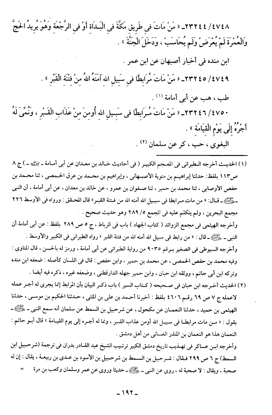 4749/ 23245 - "منْ مَاتَ مُرَابِطًا في سَبِيلِ اللهِ آمَنَهُ اللهُ مِنْ فِتْنَةِ الْقَبْرِ".