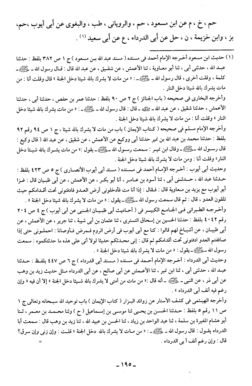 (¬1) حديث ابن مسعود أخرجه الإمام أحمد في مسنده (مسند عبد الله بن مسعود) ج 1 ص 382 بلفظ: حدثنا عبد الله، حدثني أبي، ثنا أبو معاوية، ثنا الأعمش، عن شقيق، عن عبد الله قال: قال رسول الله - صلى الله عليه وسلم - كلمة، وقلت أخرى، قال رسول الله - صلى الله عليه وسلم -: "من مات لا يشرك بالله شيئًا دخل الجنة" قال وقلت أنا: من مات يشرك بالله شيئًا دخل النار.