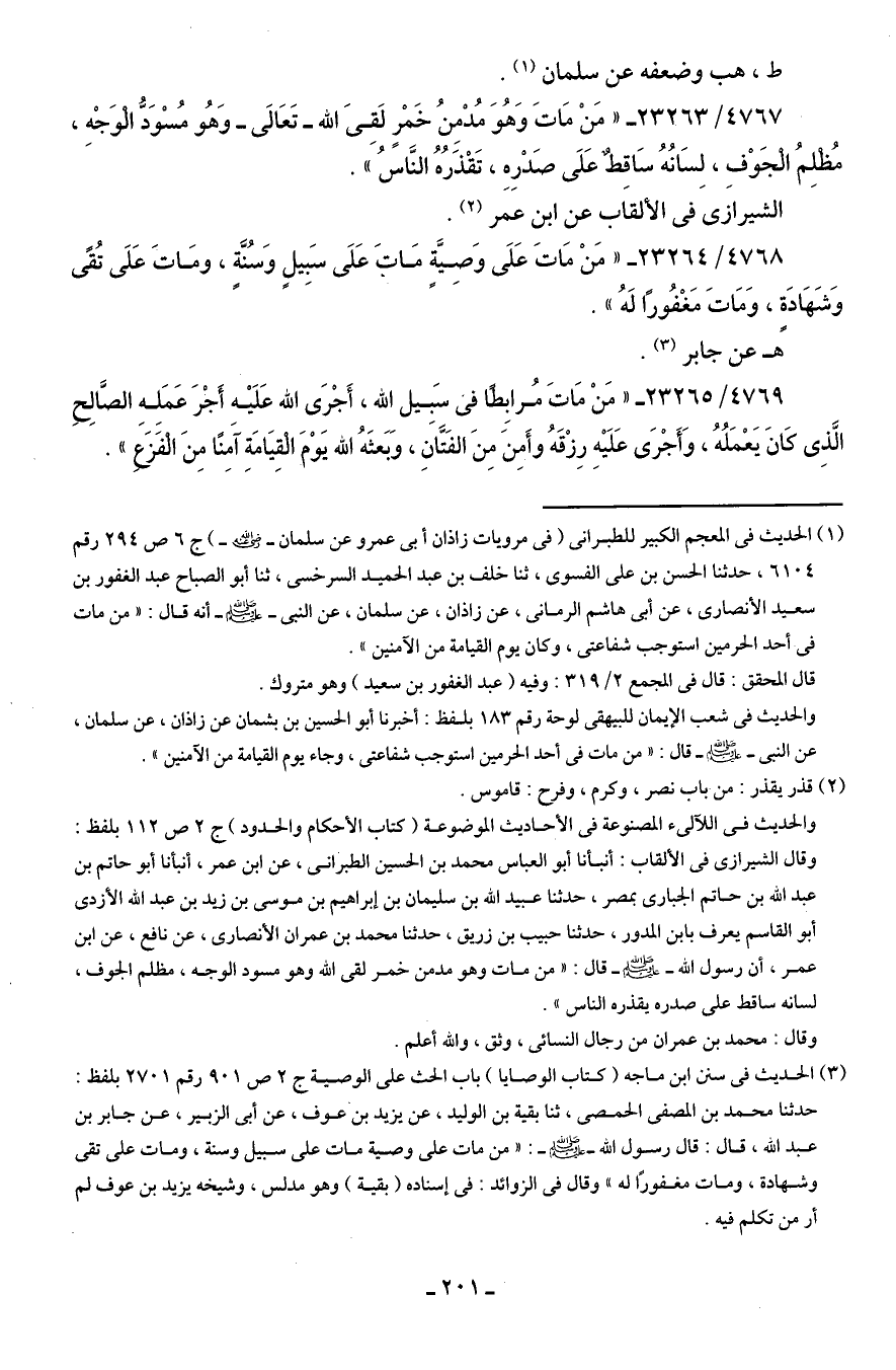 (¬1) الحديث في المعجم الكبير للطبراني (في مرويات زاذان أبي عمرو عن سلمان - رضي الله عنه -) ج 6 ص 294 رقم 6104، حدثنا الحسن بن علي الفسوى، ثنا خلف بن عبد الحميد السرخسى، ثنا أبو الصباح عبد الغفور بن سعيد الأنصاري، عن أبي هاشم الرمانى، عن زاذان، عن سلمان، عن النبي - صلى الله عليه وسلم - أنه قال: "من مات في أحد الحرمين استوجب شفاعتى، وكان يوم القيامة من الآمنين".