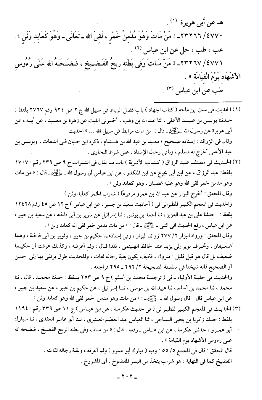 4770/ 23266 - "مَنْ مَاتَ وَهُوَ مُدْمِنُ خَمْرٍ، لَقِيَ الله - تَعَالى - وَهُوَ كَعَابِدِ وَثَنٍ".