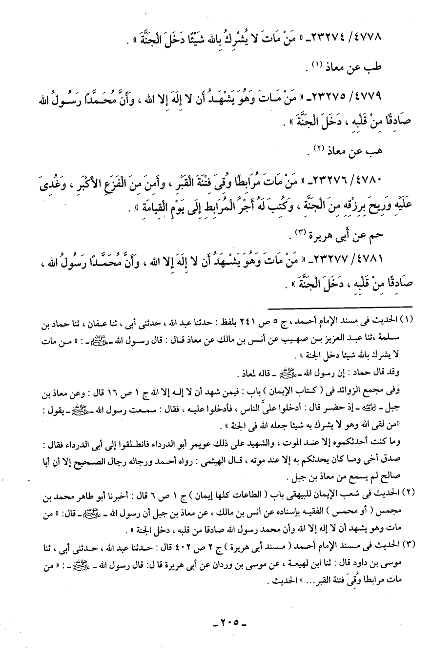 وفي مجمع الزوائد في (كتاب الإيمان) باب: فيمن شهد أن لا إله إلا الله ج 1 ص 16 قال: وعن معاذ بن جبل - رضي الله عنه - إذ حضر قال: أدخلوا عليَّ الناس، فأدخلوا عليه، فقال: سمعت رسول الله - صلى الله عليه وسلم - يقول: "من لقى الله وهو لا يشرك به شيئًا جعله الله في الجنة".