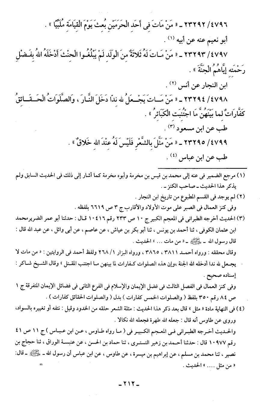 4797/ 23293 - "مَنْ مَاتَ لَهُ ثَلاثَةٌ مِنَ الْوَلَد لَمْ يَبْلُغُوا الْحنْثَ أَدْخَلَهُ اللهُ بفَضْلِ رَحْمَتِهِ إيَّاهُمُ الْجَنَّة".