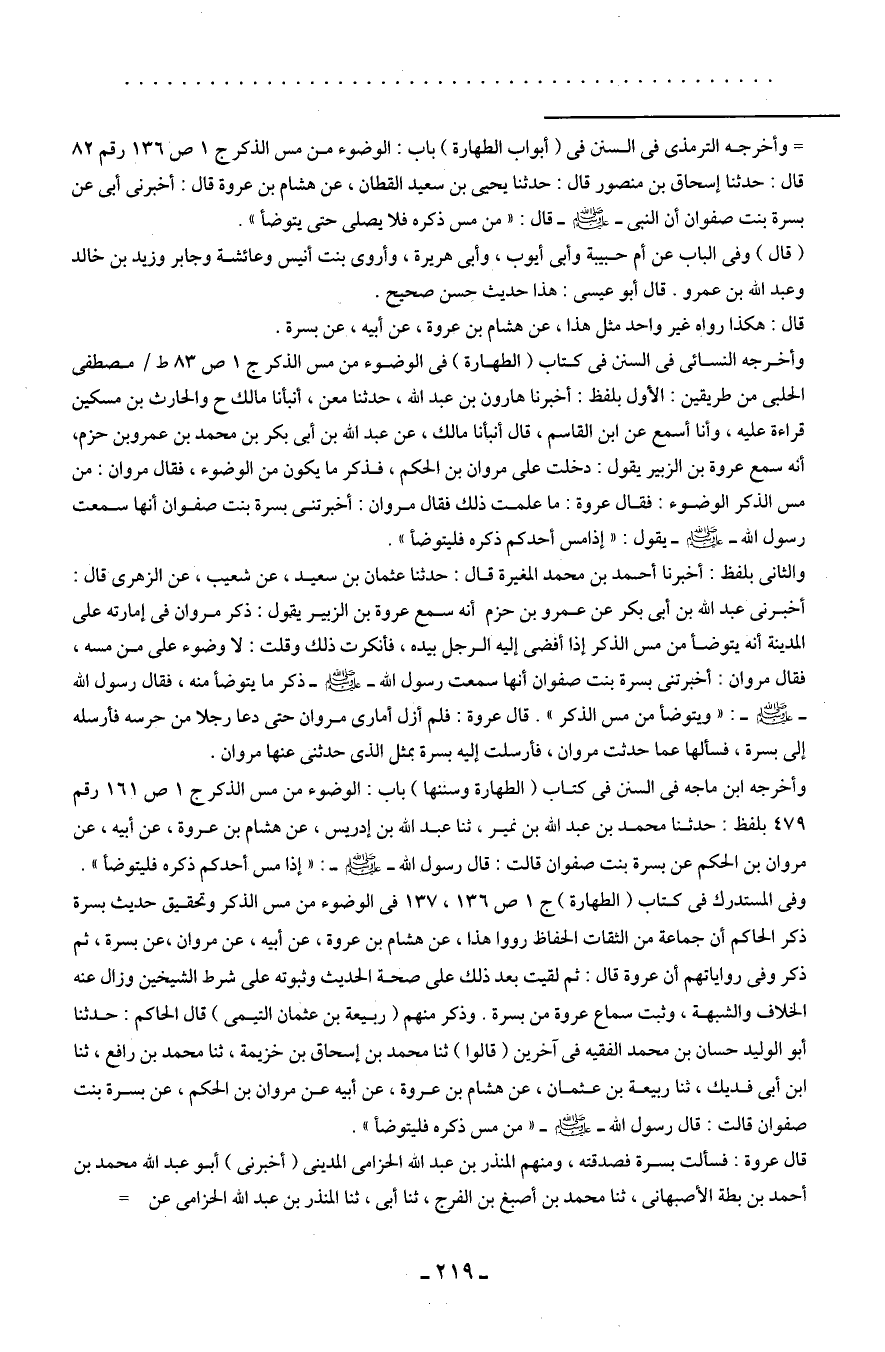وفي المستدرك في كتاب (الطهارة) ج 1 ص 136، 137 في الوضوء من مس الذكر وتحقيق حديث بسرة ذكر الحاكم أن جماعة من الثقات الحفاظ رووا هذا، عن هشام بن عروة، عن أبيه، عن مروان، عن بسرة، ثم ذكر وفي رواياتهم أن عروة قال: ثم لقيت بعد ذلك على صحة الحديث وثبوته على شرط الشيخين وزال عنه الخلاف والشبهة، وثبت سماع عروة من بسرة. وذكر منهم (ربيعة بن عثمان التيمي) قال الحاكم: حدثنا أبو الوليد حسان بن محمد الفقيه في آخرين (قالوا) ثنا محمد بن إسحاق بن خزيمة، ثنا محمد بن رافع، ثنا ابن أبي فديك، ثنا ربيعة بن عثمان، عن هشام بن عروة، عن أبيه عن مروان بن الحكم، عن بسرة بنت صفوان قالت: قال رسول الله - صلى الله عليه وسلم - "من مس ذكره فليتوضأ".