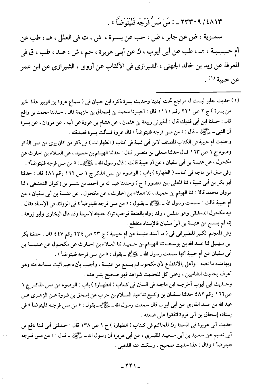 4813/ 23309 - "مَنْ مَسَّ فَرْجَه فَليَتَوَضَّأ".