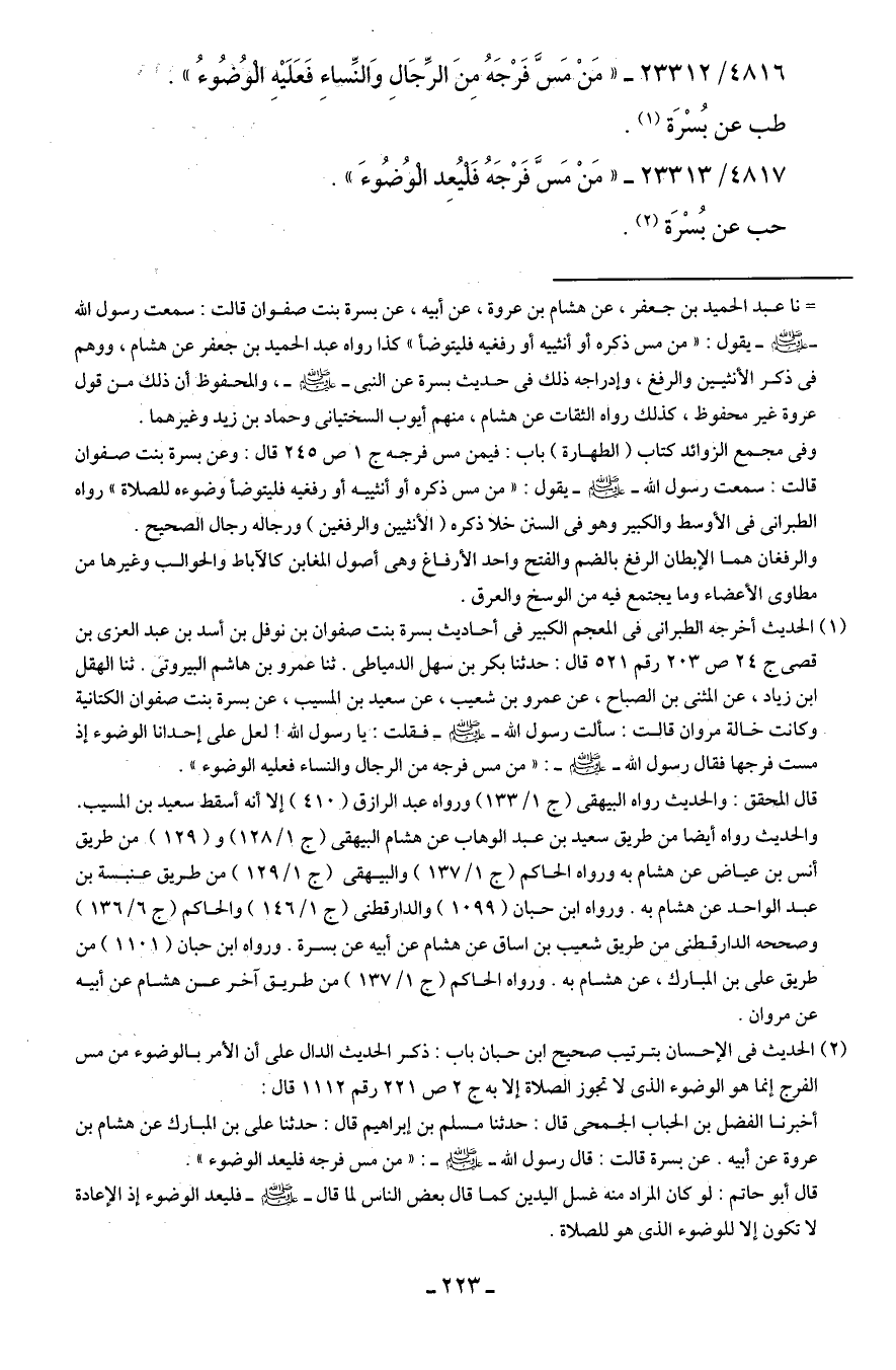 4816/ 23312 - "مَنْ مَسَّ فَرْجَهُ مِنَ الرِّجَالِ وَالنِّساءِ فَعَلَيهِ الْوُضُوءُ".