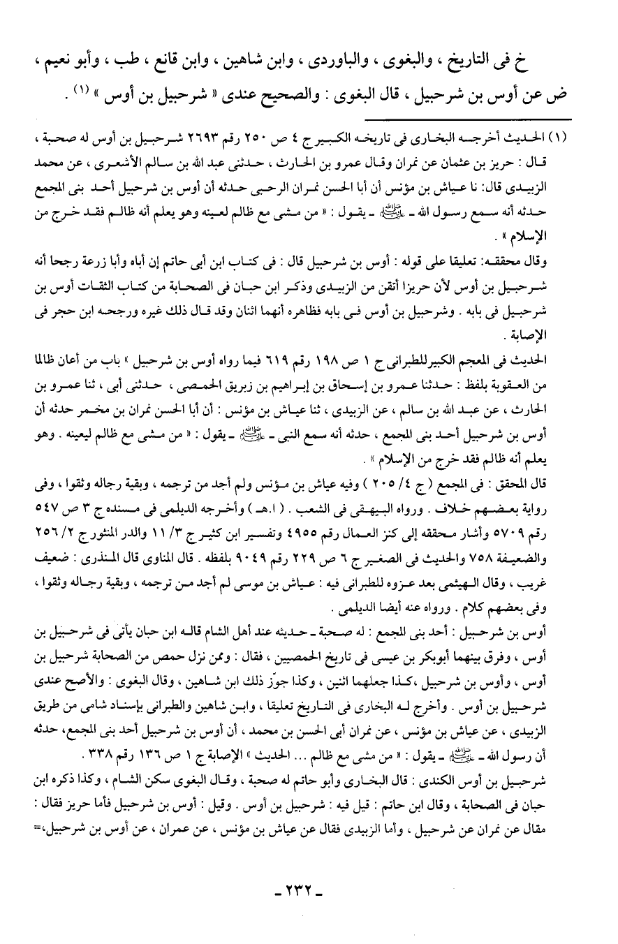 (¬1) الحديث أخرجه البخاري في تاريخه الكبير ج 4 ص 250 رقم 2693 شرحبيل بن أوس له صحبة، قال: حريز بن عثمان عن نمران وقاد عمرو بن الحارث، حدثني عبد الله بن سالم الأشعري، عن محمد الزبيدي قال: نا عياش بن مؤنس أن أبا الحسن نمران الرحبى حدثه أن أوس بن شرحبيل أحد بنى المجمع حدثه أنه سمع رسول الله - صلى الله عليه وسلم - يقول: "من مشى مع ظالم لعينه وهو يعلم أنه ظالم فقد خرج من الإسلام".