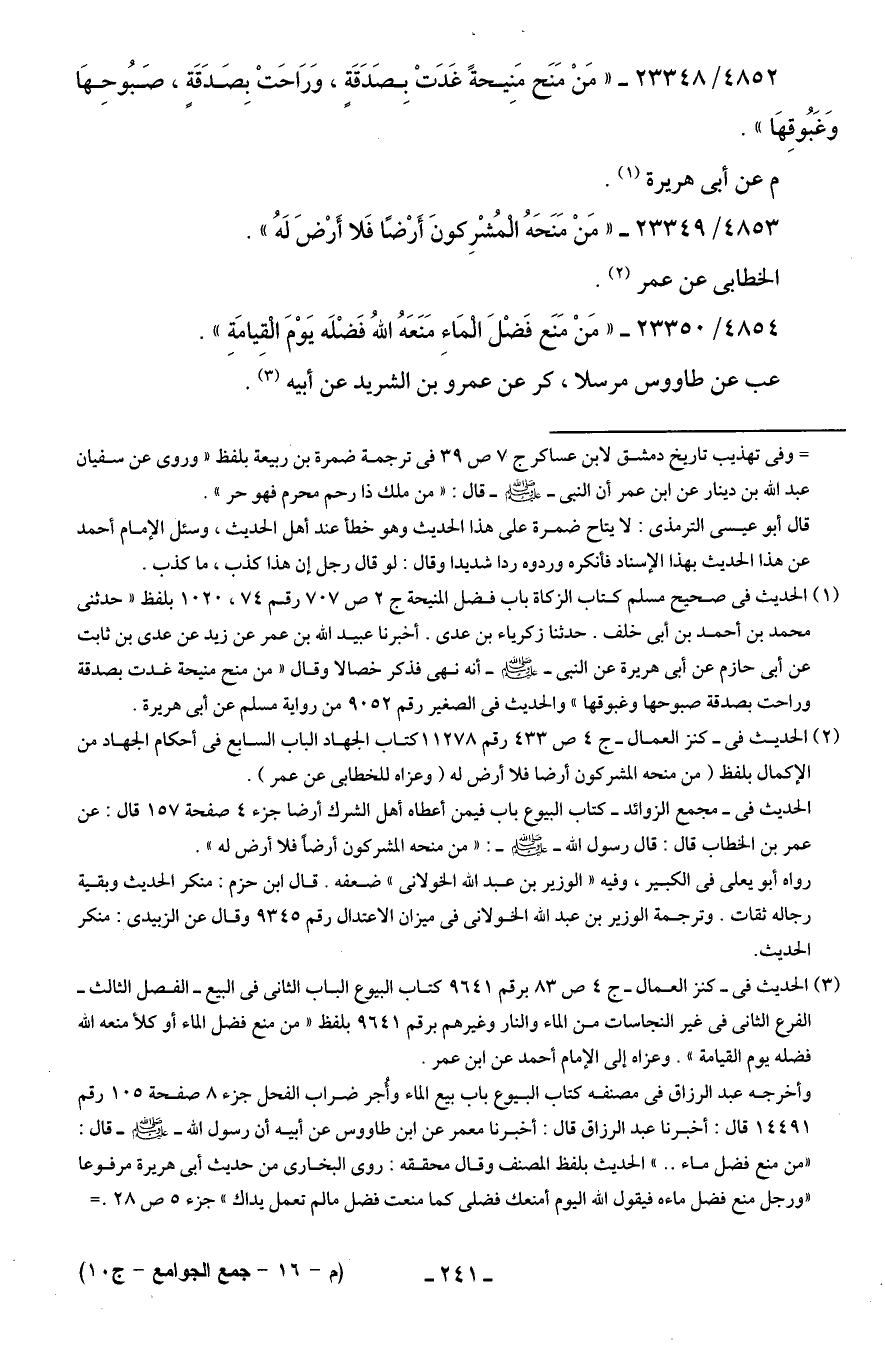 (¬3) الحديث في -كنز العمال- ج 4 ص 83 برقم 9641 كتاب البيوع الباب الثاني في البيع - الفصل الثالث- الفرع الثاني في غير النجاسات من الماء والنار وغيرهم برقم 9641 بلفظ "من منع فضل الماء أو كلأ منعه الله فضله يوم القيامة". وعزاه إلى الإمام أحمد عن ابن عمر.