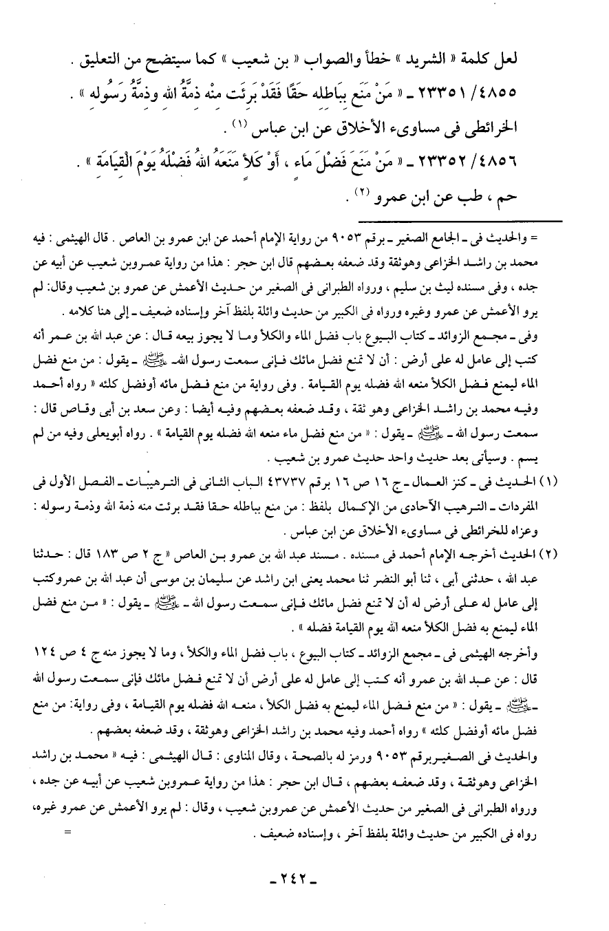 (¬2) الحديث أخرجه الإمام أحمد في مسنده. مسند عبد الله بن عمرو بن العاص "ج 2 ص 183 قال: حدثنا عبد الله، حدثني أبي، ثنا أبو النضر ثنا محمد يعني ابن راشد عن سليمان بن موسى أن عبد الله بن عمرو كتب إلى عامل له على أرض له أن لا تمنع فضل مائك فإني سمعت رسول الله - صلى الله عليه وسلم - يقول: "من منع فضل الماء ليمنع به فضل الكلأ منعه الله يوم القيامة فضله".