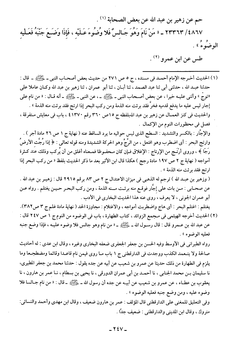 4867/ 23363 - "مَنْ نَامَ وَهُوَ جَالِسٌ فَلا وُضُوءَ عَلَيهِ، فَإِذَا وَضَعَ جَنْبَهُ فَعَليهِ الوضُوءُ".