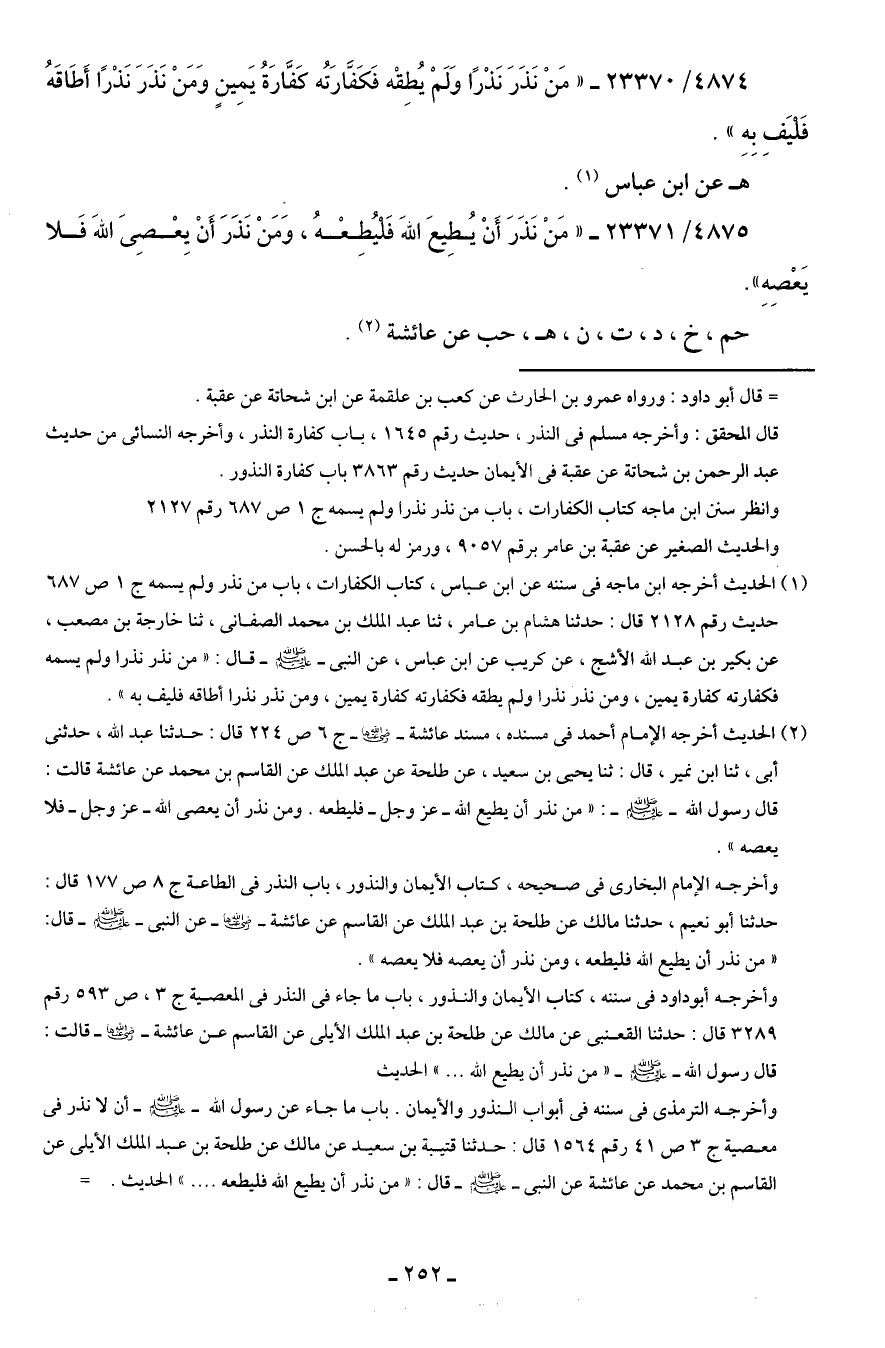 (¬2) الحديث أخرجه الإمام أحمد في مسنده، مسند عائشة - رضي الله عنها - ج 6 ص 224 قال: حدثنا عبد الله، حدثني أبي، ثنا ابن نمير، قال: ثنا يحيى بن سعيد، عن طلحة عن عبد الملك عن القاسم بن محمد عن عائشة قالت: قال رسول الله - صلى الله عليه وسلم -: "من نذر أن يطيع الله -عزَّ وجلَّ- فليطعه. ومن نذر أن يعصى الله -عزَّ وجلَّ- فلا يعصه".