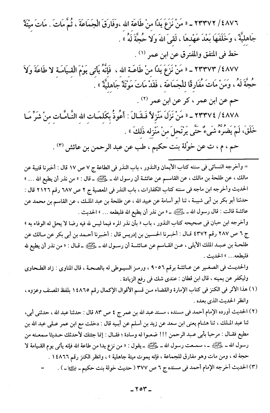 4876/ 23372 - "مَنْ نَزع يَدًا مِنْ طَاعَةِ اللهِ، وَفَارَقَ الجَمَاعَةَ، ثُمَّ مَاتَ. مَاتَ مِيتَةً جَاهِلِيَّةً، وَخَلَفَهَا بَعْدَ عَهْدِهَا، لَقِيَ اللهَ وَلا حُجَّةَ لَهُ".