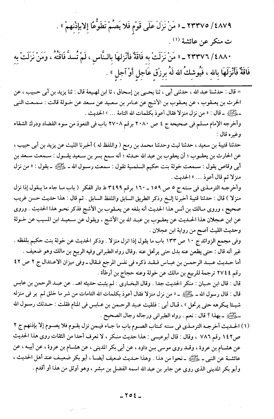 وأخرجه الترمذي في سننه ج 5 ص 159 - 160 برقم 3499 ط دار الفكر (باب ما جاء ما يقول إذا نزل منزلًا) قال: حدثنا قتيبة أخبرنا إلخ وذكر الطريق السابق واللفظ السابق. ثم قال: هذا حديث حسن غريب صحيح، وروى مالك بن أنس هذا الحديث أنه بلغه عن يعقوب بن الأشج فذكر نحو هذا الحديث. وروى عن ابن عجلان هذا الحديث عن يعقوب بن عبد الله بن الأشج، ويقول عن سعيد ابن المسيب عن خولة وحديث الليث أصح من رواية ابن عجلان.