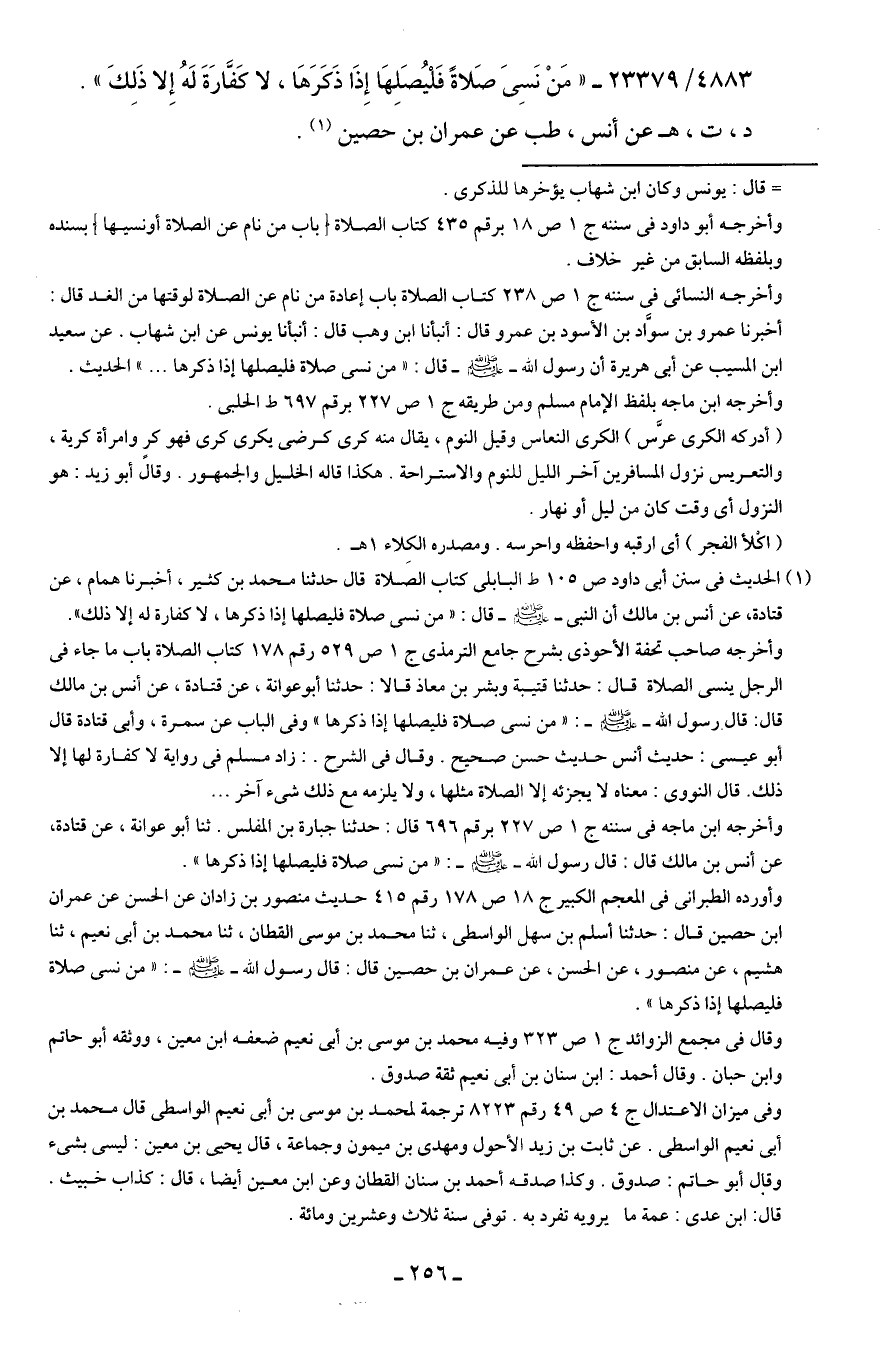 4883/ 23379 - "مَنْ نَسِيَ صَلاةً فَلْيُصَلِهَا إِذَا ذَكرَهَا، لا كَفارَةَ لَهُ إِلا ذَلِكَ".
