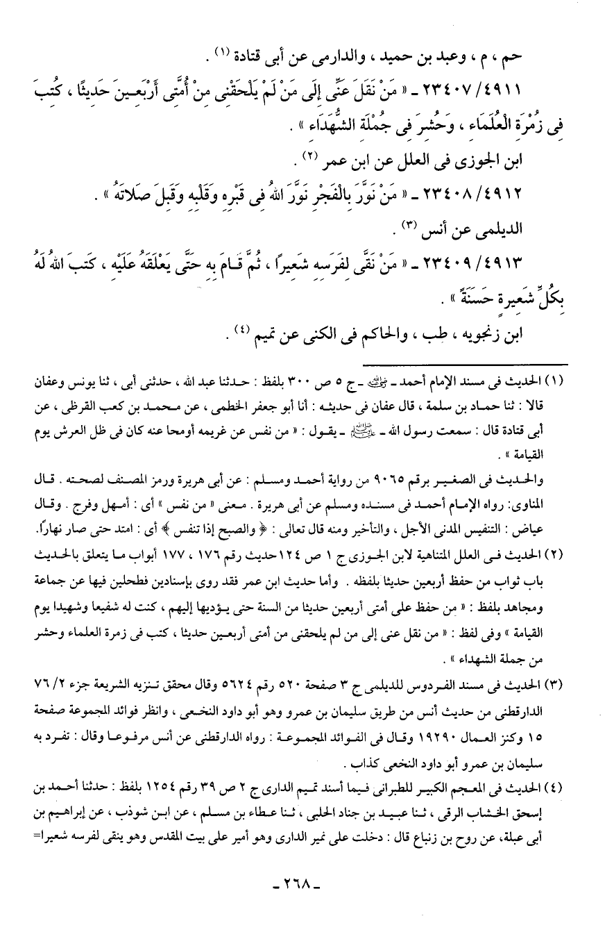 4911/ 23407 - "مَنْ نَقلَ عنِّي إِلَى مَنْ لَمْ يَلحَقْنِي مِنْ أُمَّتِي أَرْبَعِينَ حَدِيثًا، كُتِبَ فِي زُمْرَةِ العُلَمَاءِ، وَحُشِرَ فِي جُمْلَةِ الشُّهَدَاءِ".