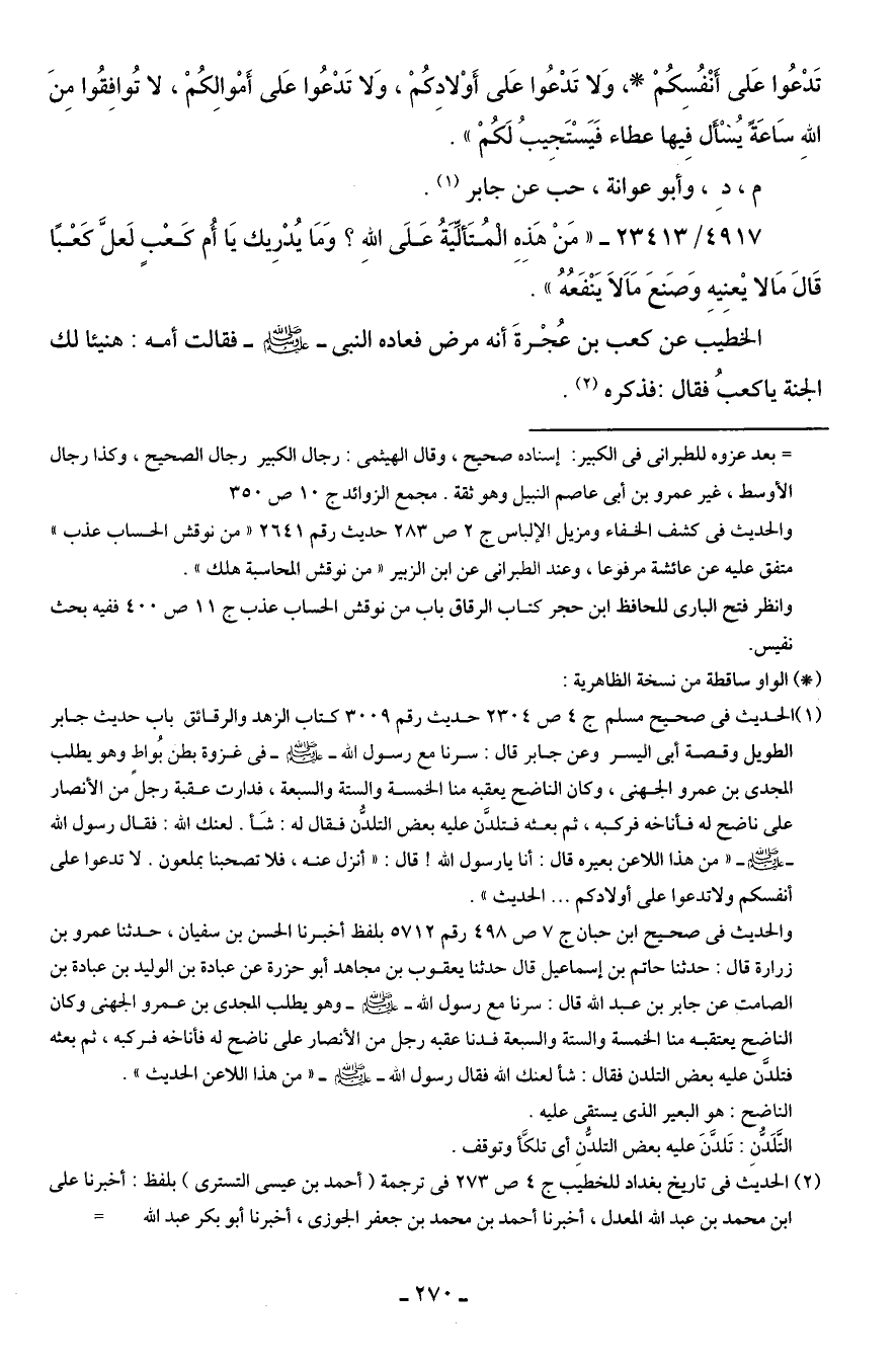 (¬1) الحديث في صحيح مسلم ج 4 ع 2304 حديث رقم 3009 كتاب الزهد والرقائق باب حديث جابر الطويل وقصة أبي اليسر وعن جابر قال: سرنا مع رسول الله - صلى الله عليه وسلم - في غزوة بطن بُواط وهو يطلب المجدى بن عمرو الجهني، وكان الناضح يعقبه منا الخمسة والستة والسبعة، فدارت عقبة رجلٍ من الأنصار على ناضح له فأناخه فركبه، ثم بعثه فتلدَّن عليه بعض التلدُّن فقال له: شَأ. لعنك الله: فقال رسول الله - صلى الله عليه وسلم - "من هذا اللاعن بعيره قال: أنا يا رسول الله" قال: "أنزل عنه، فلا تصحبنا بملعون. لا تدعوا على أنفسكم ولا تدعوا على أولادكم ... الحديث".