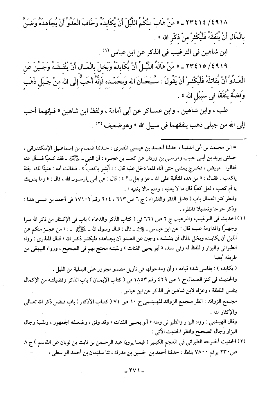 4919/ 23415 - "مَنْ هَالهُ اللِّيلُ أَنْ يُكَابِدَهُ وَبَخِلَ بِالمَالِ أَنْ يُنْفِقَهُ وَجَبُنَ عَنِ العَدُوِّ أَنْ يُقاتِلَهُ فَليُكْثِرْ أَنْ يَقُولَ: سُبْحَانَ اللهِ وَبِحَمْدِهِ فَإِنَّهُ أَحَبُّ إِلَى اللهِ مِنْ جَبَلِ ذَهَبٍ وَفِضَّةٍ يُنْفَقَا فِي سَبِيلِ اللهِ".