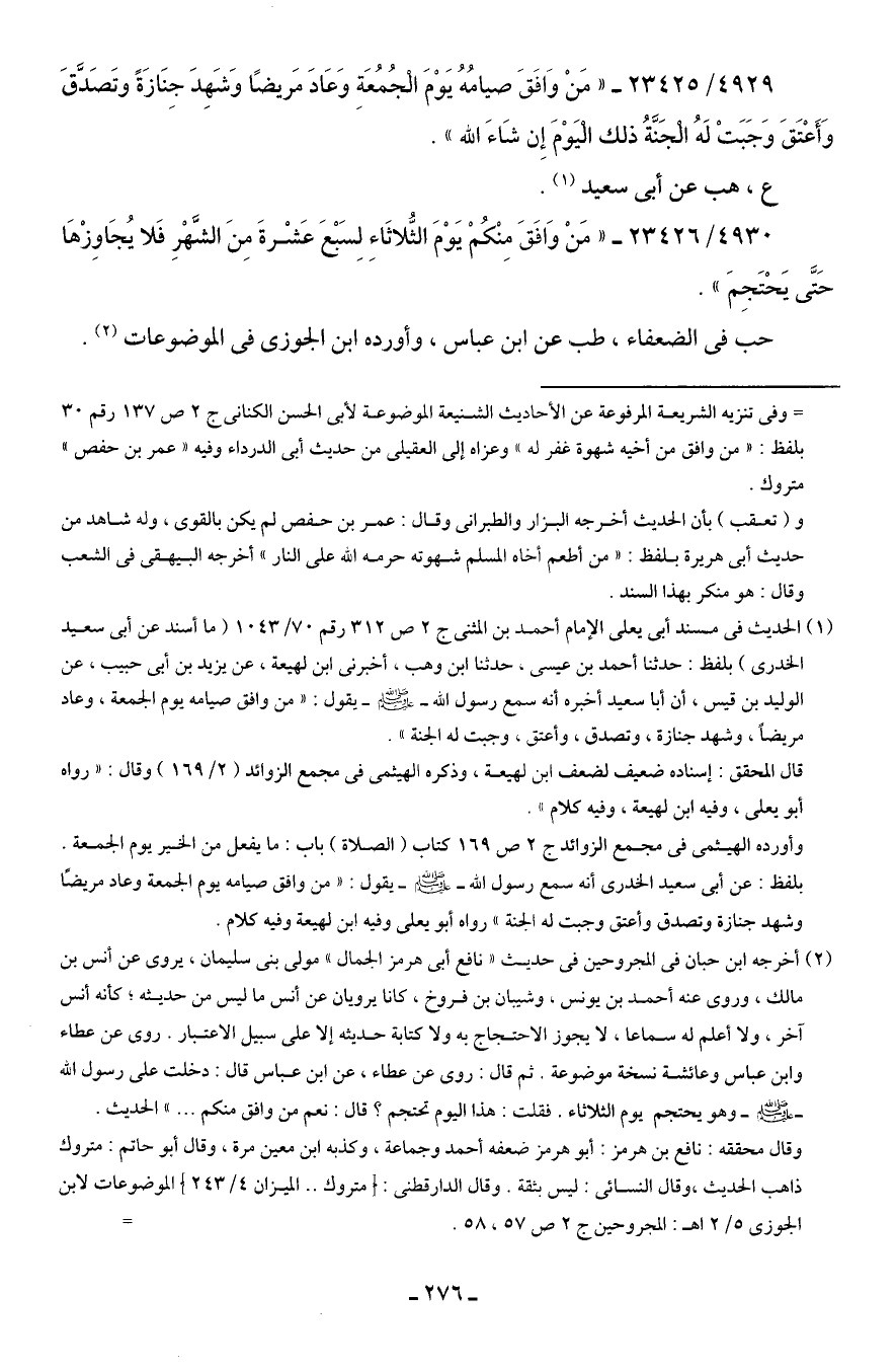4929/ 23425 - "مَنْ وَافَقَ صيامُهُ يَوْمَ الجُمُعَةِ وَعَادَ مَريضًا وَشَهِدَ جِنَازَةً وتَصَدَّقَ وَأَعْتَقَ وَجَبَتْ لَهُ الجَنةُ ذلك اليَوْمَ إِن شَاءَ الله".