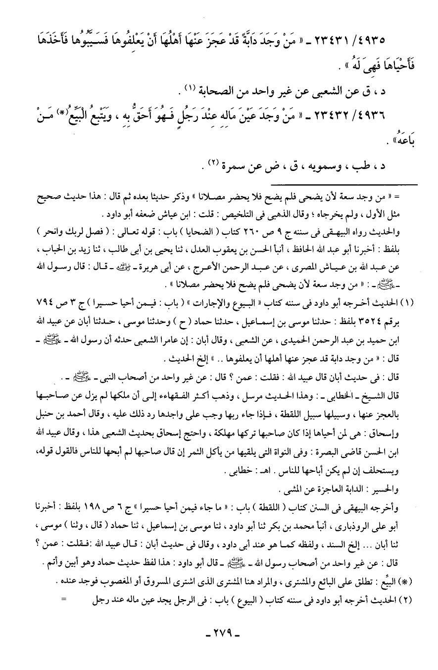 4935/ 23431 - "مَنْ وَجَدَ دَابَّةً قَدْ عَجَزَ عَنْهَا أَهْلُهَا أَنْ يَعْلِفُوهَا فَسَيَّبُوُها فَأَخَذَهَا فَأَحْيَاهَا فَهِيَ لَهُ".