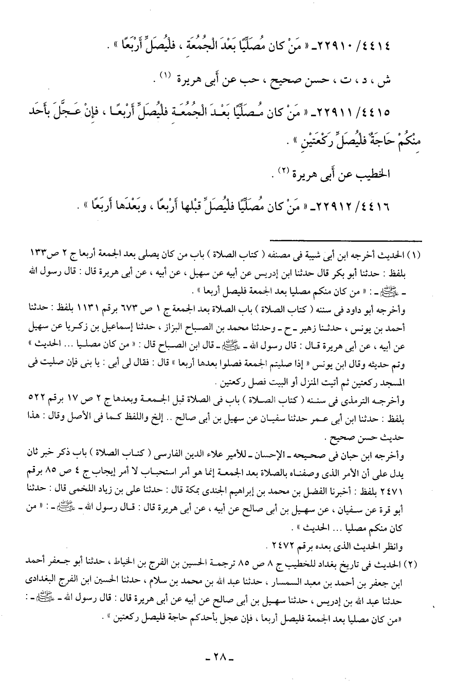 4414/ 22910 - "مَنْ كان مُصَلِّيًا بَعْدَ الْجُمُعَةِ، فلْيُصَلِّ أَرْبَعًا".