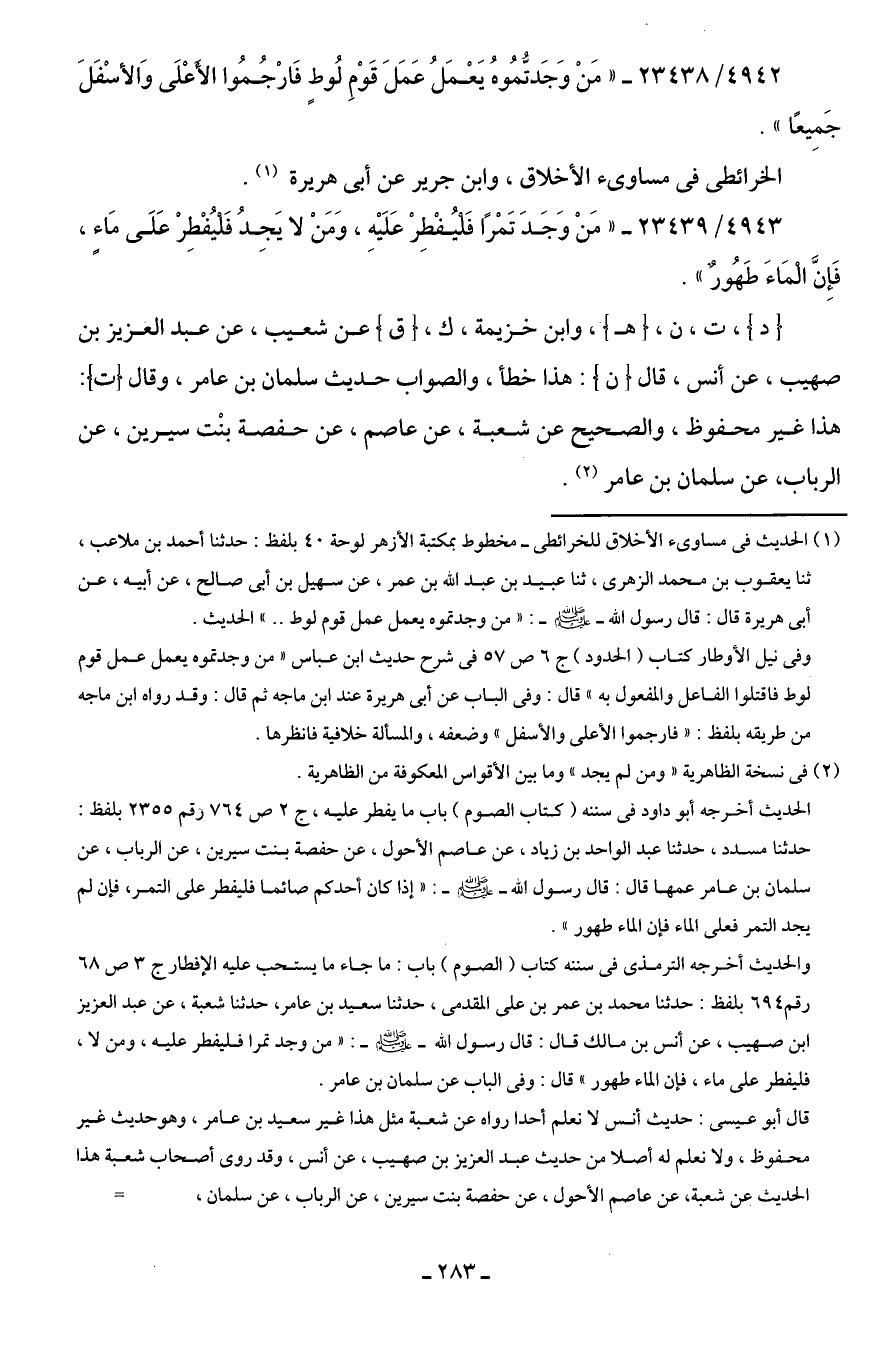 (¬1) الحديث في مساوئ الأخلاق للخرائطى- مخطوط بمكتبة الأزهر لوحة 40 بلفظ: حدثنا أحمد بن ملاعب، ثنا يعقوب بن محمد الزهري، ثنا عبيد بن عبد الله بن عمر، عن سهيل بن أبي صالح، عن أبيه، عن أبي هريرة قال: قال رسول الله - صلى الله عليه وسلم -: "من وجدتموه يعمل عمل قوم لوط .. " الحديث.