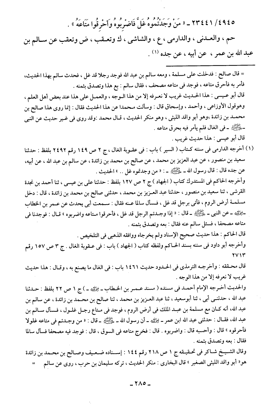 وأخرجه الحاكم في المستدرك كتاب (الجهاد) ج 2 ص 127 بلفظ: حدثنا علي بن عيسى، ثنا أحمد بن نجدة القرشي، ثنا سعيد بن منصور، حدثنا عبد العزيز بن محمد، حدثني صالح بن محمد بن زائدة، قال: دخل مسلمة أرض الروم، فأتى برجل قد غل، فسأل سالما عنه فقال: سمعت أبي يحدث عن عمر بن الخطاب - رضي الله عنه - عن النبي - صلى الله عليه وسلم - قال: "إذا وجدتم الرجل قد غل، فأحرقوا متاعه واضربوه" قال: فوجدنا في متاعه مصحفا، فسئل سالم عنه فقال: بعه وتصدق بثمنه.