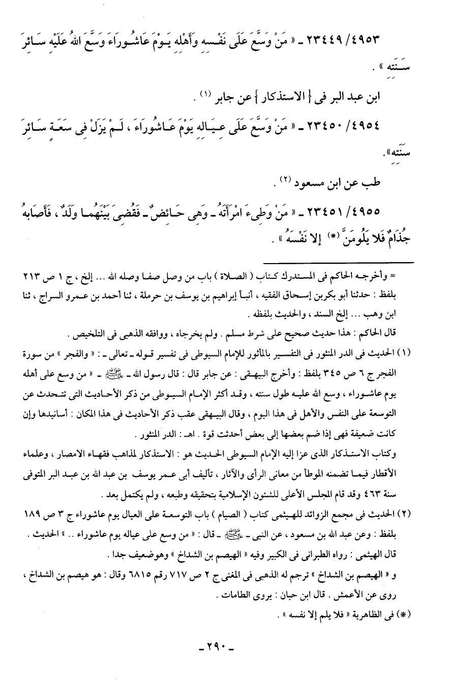 4953/ 23449 - "مَنْ وَسَّعَ عَلَى نَفْسِهِ وَأَهْلِهِ يَوْمَ عَاشُورَاءَ وَسَّعَ اللهُ عَلَيهِ سَائِرَ سنته".