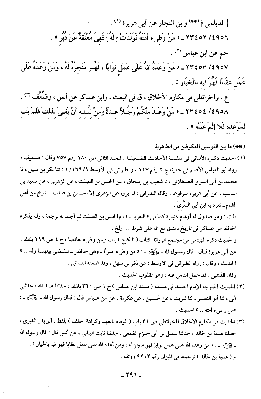 4958/ 23454 - "مَنْ وَعَدَ مِنكُمْ رَجُلًا عِدَةً وَمِنْ نِيَّتِهِ أَنْ يَفِي بِذَلِكَ فَلَمْ يَفِ لِمَوْعِدهِ فَلا إِثْمَ عَلَيهِ".
