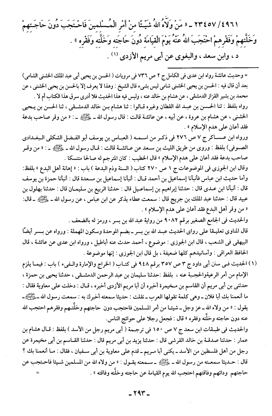 4961/ 23457 - "مَنْ وَلَّاهُ اللهُ شَيئًا مِنْ أَمْرِ المُسْلمِينَ فَاحْتَجَبَ دُونَ حَاجَتِهِمْ وَخَلَّتِهِمْ وَفَقْرِهِمْ احْتَجَبَ اللهُ عَنْهُ يَوْمَ القِيَامَةِ دُونَ حَاجَتِهِ وَخَلَّتِهِ وَفَقْرِهِ".