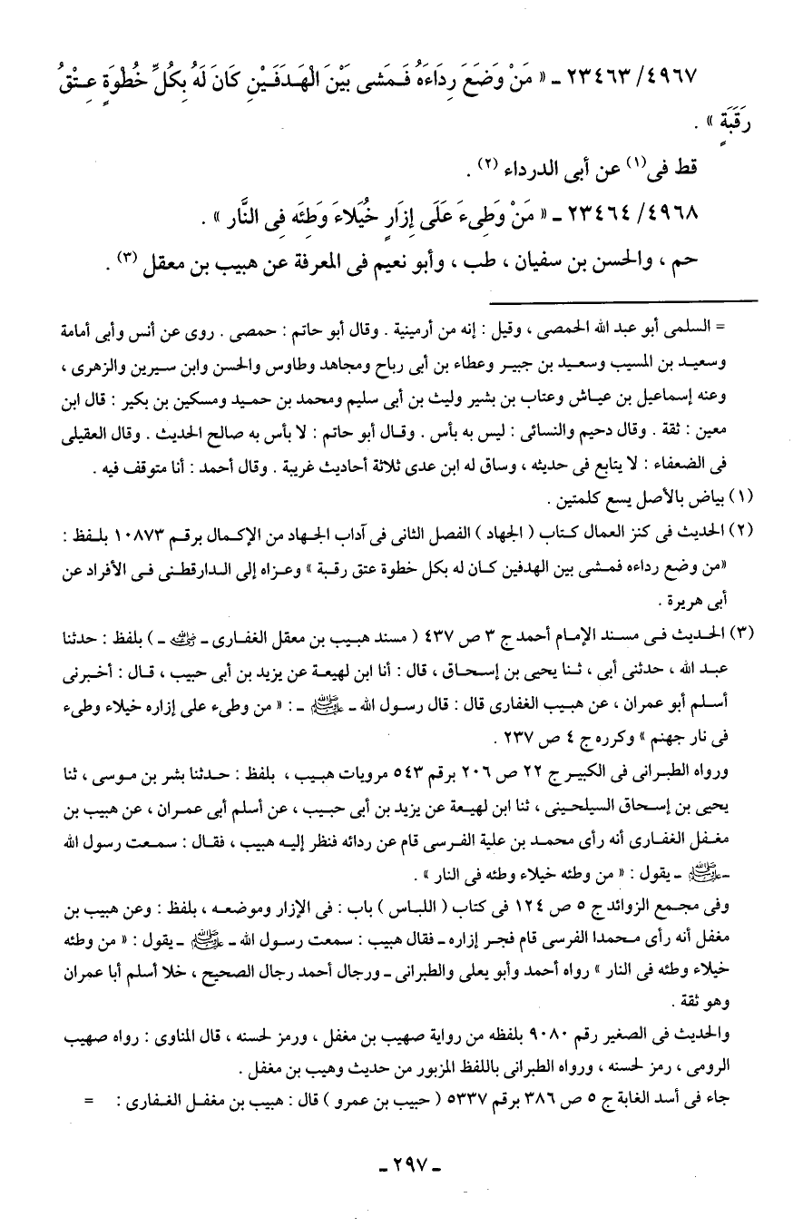 (¬3) الحديث في مسند الإمام أحمد ج 3 ص 437 (مسند هبيب بن معقل الغفاري - رضي الله عنه -) بلفظ: حدثنا عبد الله، حدثني أبي، حدثنا يحيى بن إسحاق، قال: أنا ابن لهيعة عن يزيد بن أبي حبيب، قال: أخبرني أسلم أبو عمران، عن هبيب الغفاري قال: قال رسول الله - صلى الله عليه وسلم -: "من وطئ على إزاره خيلاء وطئ في نار جهنم" وكرره ج 4 ص 237.