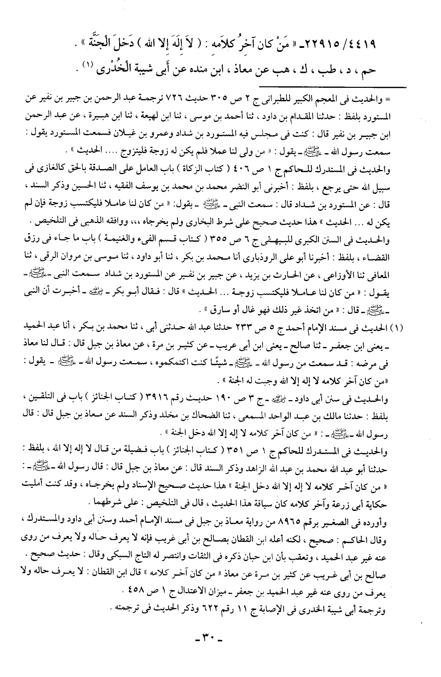 4419/ 22915 - "مَنْ كان آخِرُ كلامهِ: (لَا إِلَهَ إِلا الله) دَخلَ الْجَنَّة".
