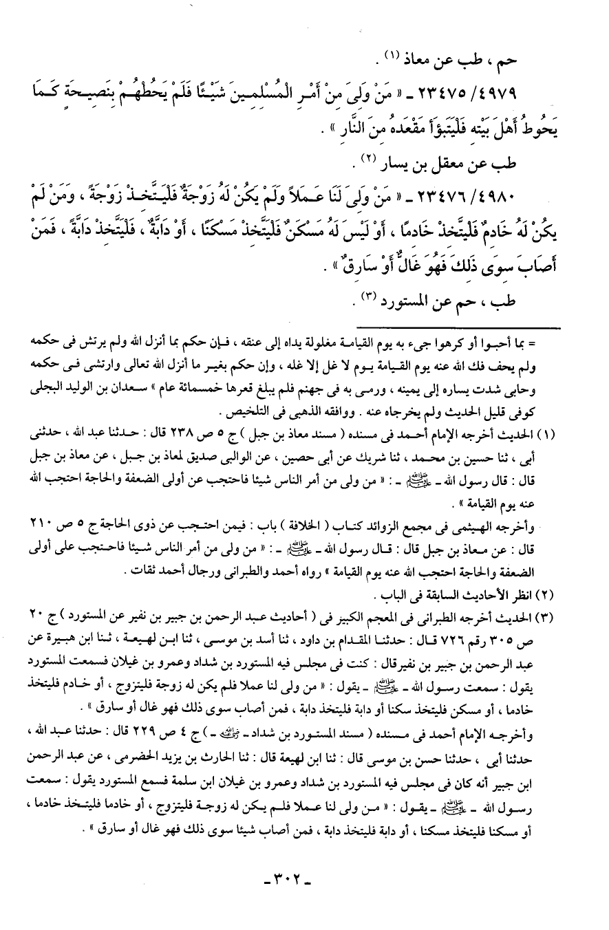 4980/ 23476 - "مَنْ وَلِيَ لَنَا عَمَلًا وَلَمْ يَكُنْ لَهُ زَوْجَةٌ فَليَتَّخذْ زَوْجَةً، وَمَنْ لَمْ يكُنْ لَهُ خَادِمٌ فَليتَّخِذْ خَادِمًا، أَوْ لَيسَ لَهُ مَسْكَنٌ فَليَتَّخِذْ مَسْكنًا، أَوْ دَابَّةٌ، فَليَتَّخِذْ دَابَّةً، فَمَنْ أَصَابَ سِوَى ذَلِكَ فَهُوَ غَالٌّ أَوْ سَارِقٌ".