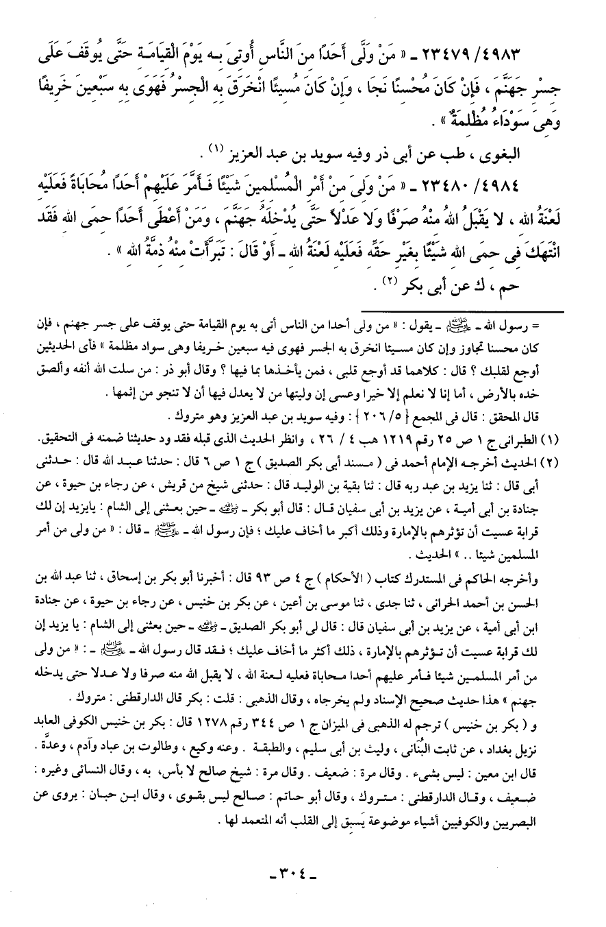 4983/ 23479 - "مَنْ وَلَّى أَحَدًا مِنَ النَّاسِ أُوتِي به يَوْمَ الْقِيَامَةِ حَتَّى يُوقَفَ عَلَى جِسْرِ جَهَنَّمَ، فَإنْ كَانَ مُحْسِنًا نَجَا، وَإِنْ كَانَ مُسِيئًا انْخَرَقَ بِهِ الْجِسْرُ فَهَوَى بِهِ سَبْعِينَ خَرِيفًا وَهِيَ سَوْدَاءُ مُظَلِمَةٌ".