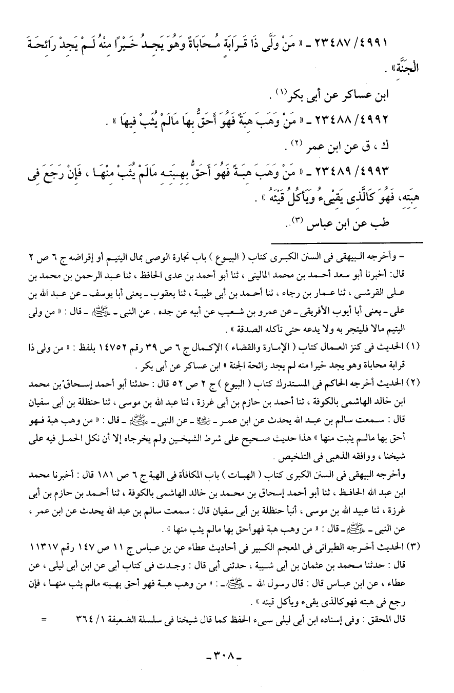 4993/ 23489 - "مَنْ وَهَبَ هِبَةً فَهُوَ أَحَقُّ بِهِبَتِهِ مَا لمْ يُثَبْ مِنْهَا، فَإِنْ رَجَعَ فِي هِبَتِهِ، فَهُوَ كَالَّذِي يَقِيْءُ وَيَأكُلُ قَيئَهُ".