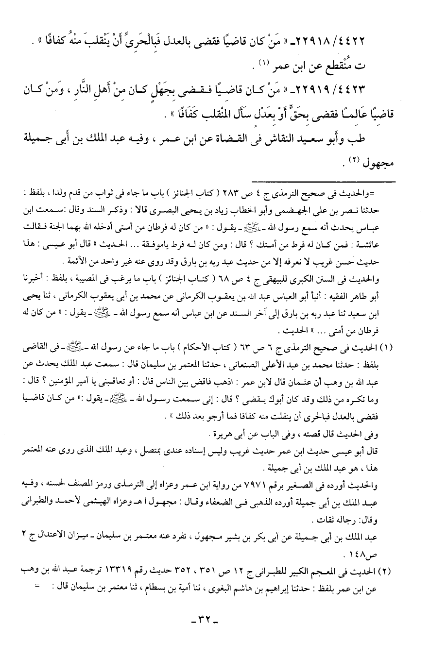 (¬1) الحديث في صحيح الترمذي ج 6 ص 63 (كتاب الأحكام) باب ما جاء عن رسول الله - صلى الله عليه وسلم - في القاضي بلفظ: حدثنا محمد بن عبد الأعلى الصنعاني، حدثنا المعتمر بن سليمان قال: سمعت عبد الملك يحدث عن عبد الله بن وهب أن عثمان قال لابن عمر: اذهب فاقض بين الناس قال: أو تعاقبني يا أمير المؤمنين؟ قال: وما تكره من ذلك وقد كان أبوك يقضى؟ قال: إني سمعت رسول الله - صلى الله عليه وسلم - يقول: "من كان قاضيا فقضى بالعدل فبالحرى أن ينفلت منه كفافا فما أرجو بعد ذلك".