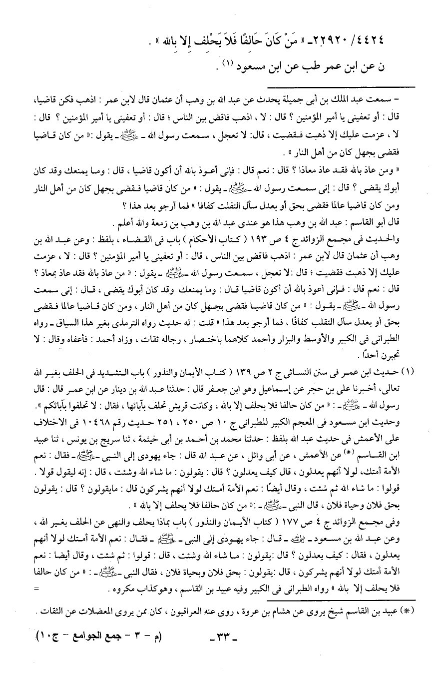 (¬1) حديث ابن عمر في سنن النسائي ج 2 ص 139 (كتاب الأيمان والنذور) باب التشديد في الحلف بغير الله تعالى، أخبرنا علي بن حجر عن إسماعيل وهو ابن جعفر قال: حدثنا عبد الله بن دينار عن ابن عمر قال: قال رسول الله - صلى الله عليه وسلم -: "من كان حالفا فلا يحلف إلا بالله، وكانت قريش تحلف بآبائها، فقال: لا تحلفوا لآبائكم".