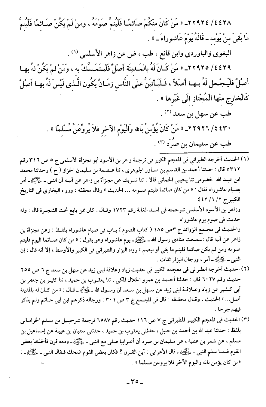 4428/ 22924 - "مَنْ كَانَ مِنْكُمْ صَائِمًا فَلْيُتِمَّ صَوْمَهُ، ومنْ لَمْ يَكُنْ صَائِمًا فَلْيُتِمَّ مَا بَقى مِنْ يَوْمِهِ -قَالهُ يَوْمَ عَاشوراءَ-".