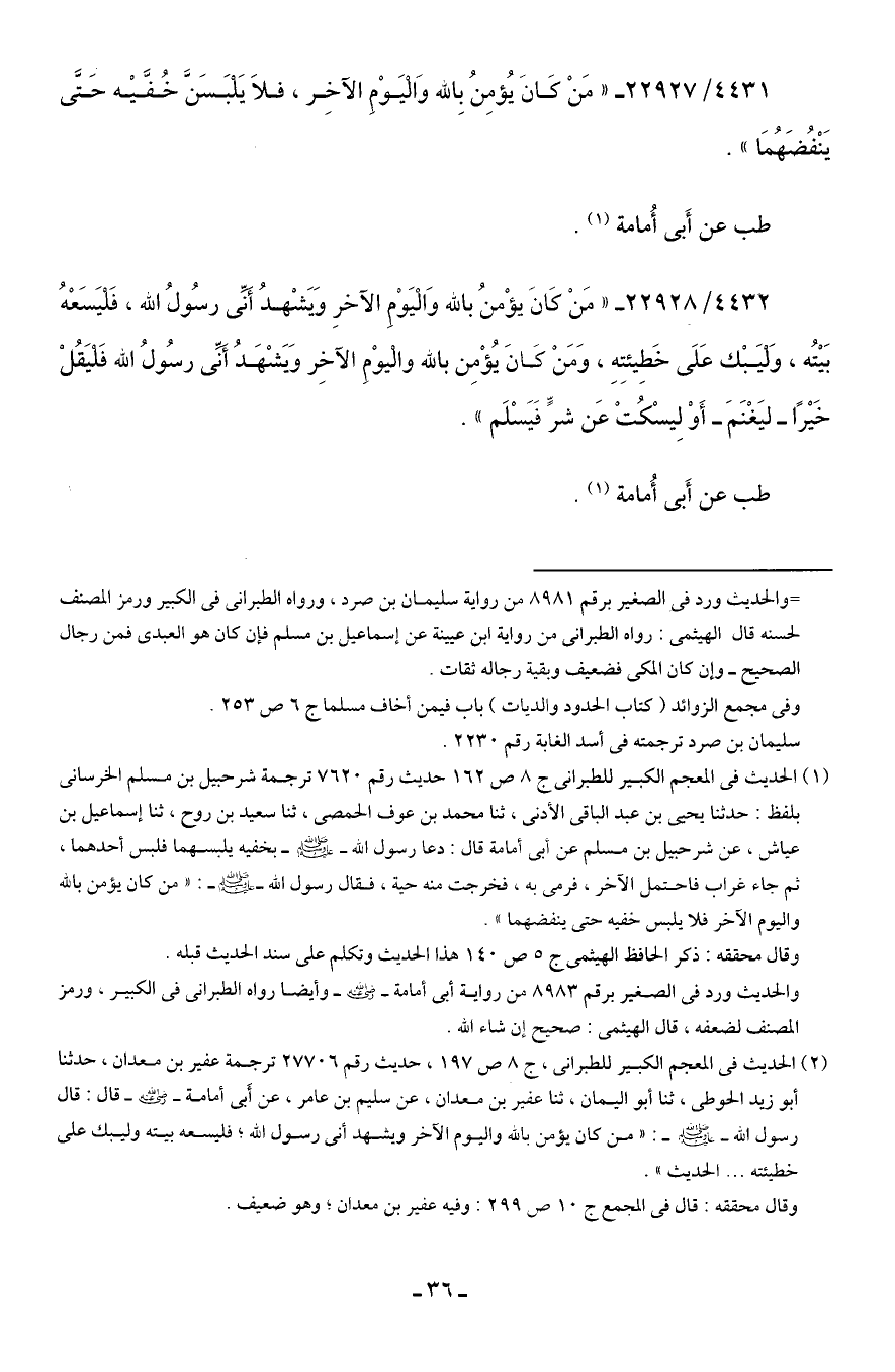 (¬2) الحديث في المعجم الكبير للطبراني، ج 8 ص 197، حديث رقم 27706 ترجمة عفير بن معدان، حدثنا أبو زيد الحوطى، ثنا أبو اليمان، ثنا عفير بن معدان، عن سليم بن عامر، عن أَبي أمامة - رضي الله عنه - قال: قال رسول الله - صلى الله عليه وسلم -: "من كان يؤمن بالله واليوم الآخر ويشهد أنى رسول الله؛ فليسعه بيته وليبك على خطيئته ... الحديث".