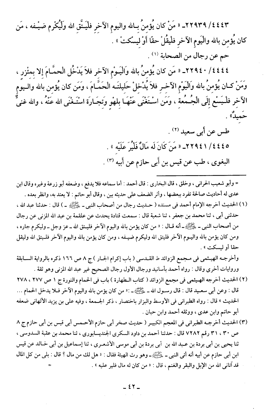4443/ 22939 - "مَنْ كان يُؤمِنُ بِالله واليومِ الآخِرِ فلْيَتَّقِ الله وَلْيُكْرم ضيفه، مَن كان يُؤمِن بالله والْيَومِ الآخرِ فلْيقُلْ حقّا أَوْ لِيسْكتْ".