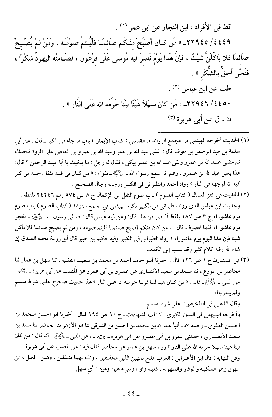 4449/ 22945 - "مَنْ كان أَصْبَحَ مِنْكُم صَائِمًا فلْيُتمَّ صوْمَه، وَمَنْ لم يُصْبِحْ صَائِمًا فَلا يَأكُلَنَّ شيئًا، فإِنَّ هَذا يَوْمٌ نُصِرَ فيه مُوسى عَلَى فِرْعَون، فصَامتْه اليهودُ شكْرًا، فنَحْن أَحَقُّ بالشُّكْرِ".