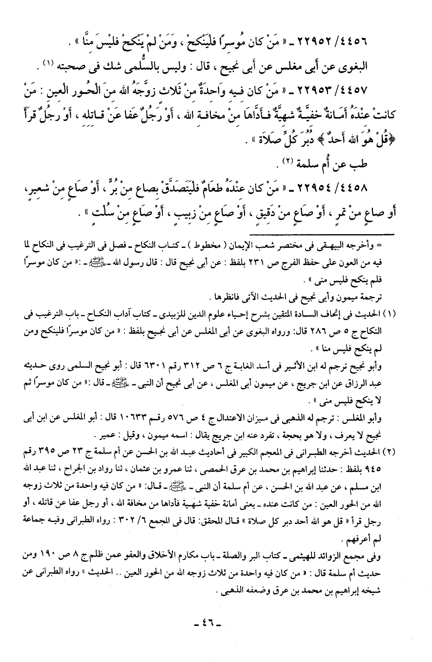 (¬1) الحديث في إتحاف السادة المتقين بشرح إحياء علوم الدين للزبيدي -كتاب آداب النكاح -باب الترغيب في النكاح ج 5 ص 286 قال: ورواه البغوي عن أبي المغلس عن أبي نجيح بلفظ: "من كان موسرًا فلينكح ومن لم ينكح فليس منا".