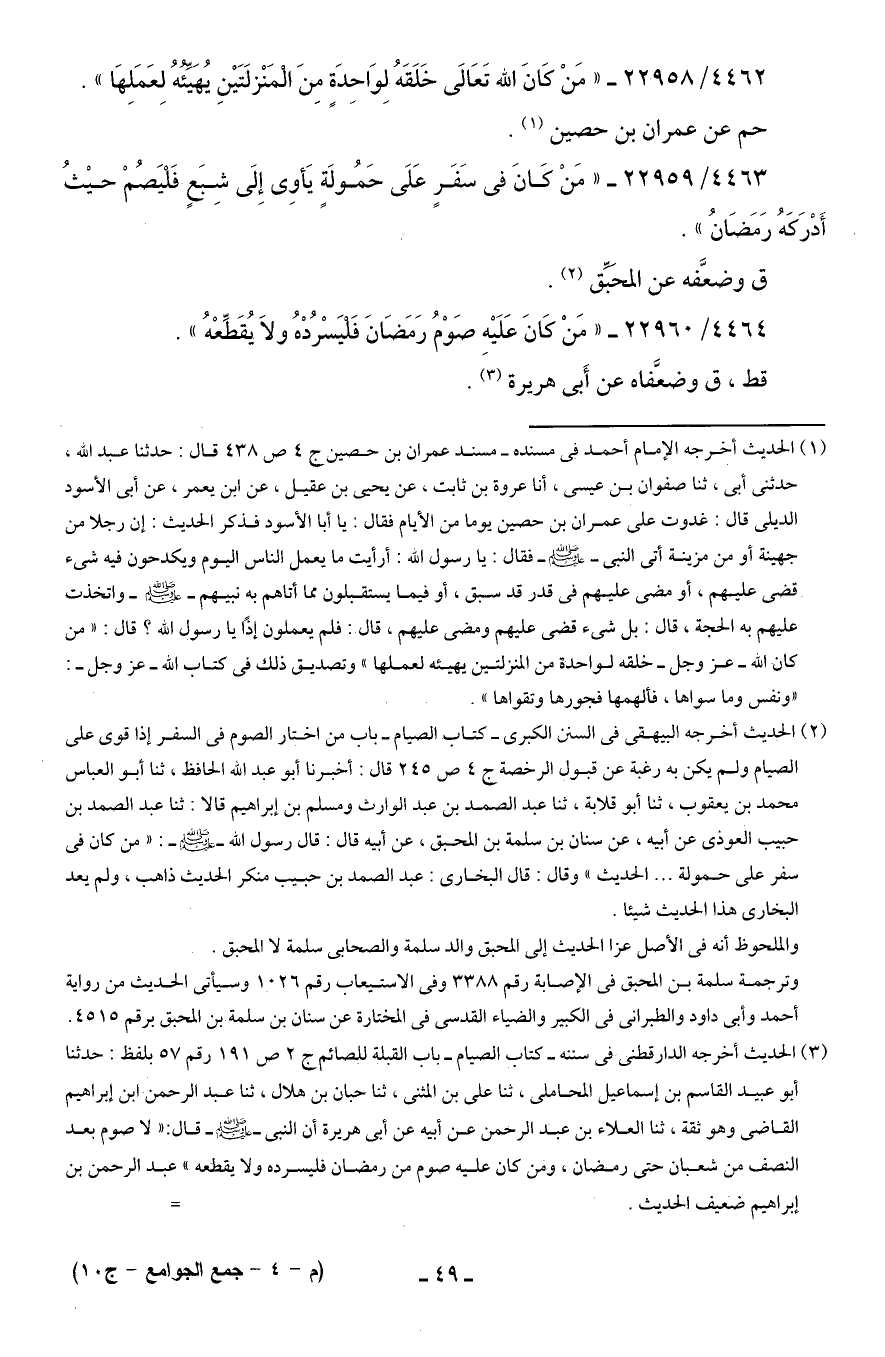 4463/ 22959 - "مَنْ كَانَ في سَفَرٍ عَلَى حَمُولَةِ يَأوى إِلَى شِبَعٍ فَلْيَصُمْ حيثُ أَدْرَكَهُ رَمَضَانُ".
