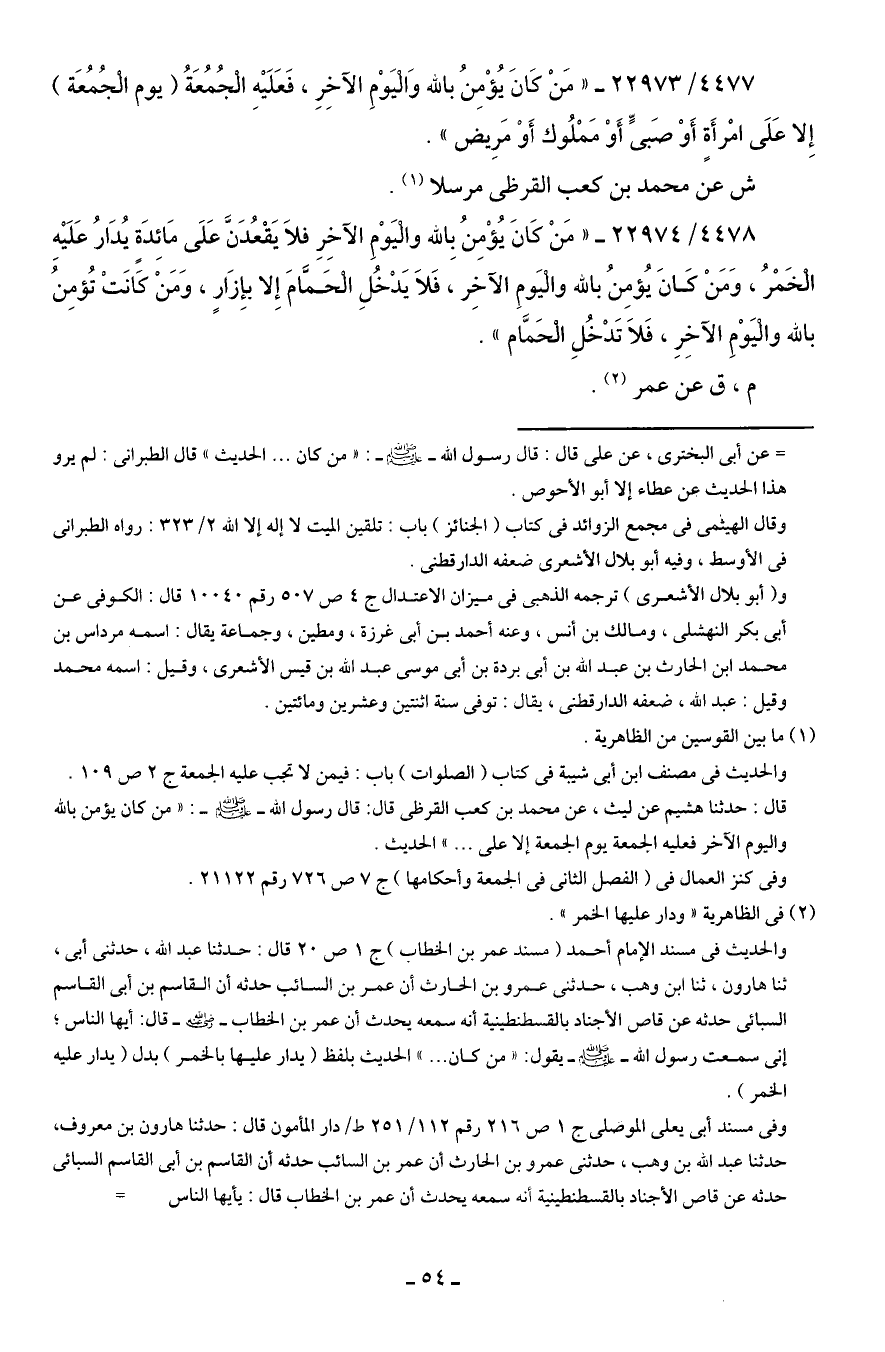 4478/ 22974 - "مَنْ كَانَ يُؤْمِنُ بِالله والْيَوْمِ الآخِرِ فلا يَقْعُدَنَّ عَلَى مَائِدَةٍ يُدَارُ عَلَيهِ الْخَمْرُ، وَمَنْ كَانَ يُؤمِنُ بالله والْيَومِ الآخِر، فَلَا يَدْخُلِ الْحَمَّامَ إِلا بإزَارٍ، وَمَنْ كَانَتْ تُؤمِنُ بالله والْيَوْمِ الآخِرِ، فَلَا تَدْخُلِ الْحَمَّام".