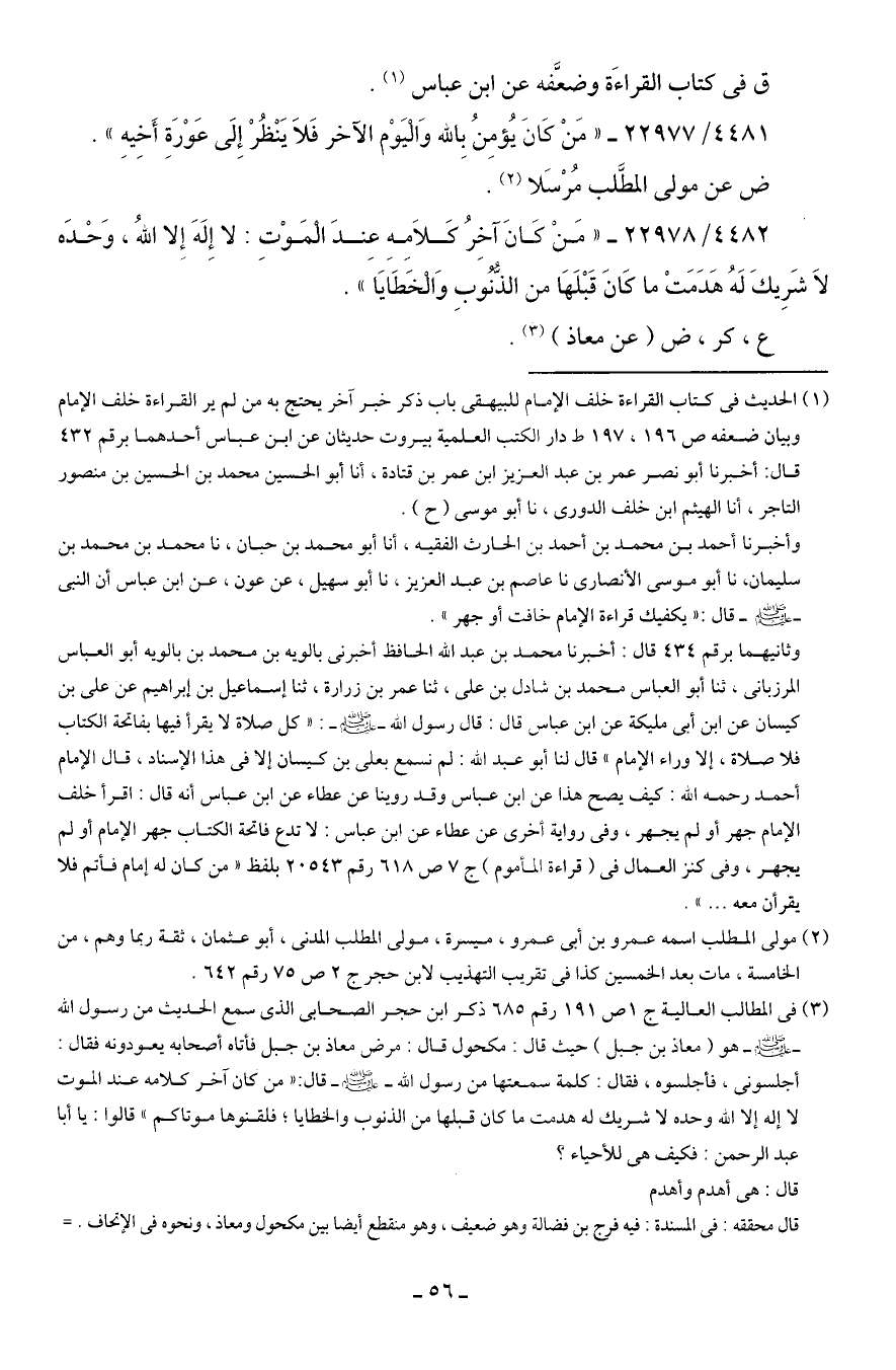 وثانيهما برقم 434 قال: أخبرنا محمد بن عبد الله الحافظ أخبرني بالويه بن محمد بن بالويه أبو العباس المرزبانى، ثنا أبو العباس محمد بن شادل بن علي، ثنا عمر بن زرارة، ثنا إسماعيل بن إبراهيم عن علي بن كيسان عن ابن أبي مليكة عن ابن عباس قال: قال رسول الله - صلى الله عليه وسلم -: "كل صلاة لا يقرأ فيها بفاتحة الكتاب فلا صلاة، إلا وراء الإمام" قال لنا أبو عبد الله: لم نسمع بعلي بن كيسان إلا في هذا الإسناد، قال الإمام أحمد رحمه الله: كيف يصح هذا عن ابن عباس وقد روينا عن عطاء عن ابن عباس أنه قال: اقرأ خلف الإمام جهر أو لم يجهر، وفي رواية أخرى عن عطاء عن ابن عباس: لا تدع فاتحة الكتاب جهر الإمام أو لم يجهر، وفي كنز العمال في (قراءة المأموم) ج 7 ص 618 رقم 20543 بلفظ "من كان له إمام فأتم فلا يقرأن معه ... ".