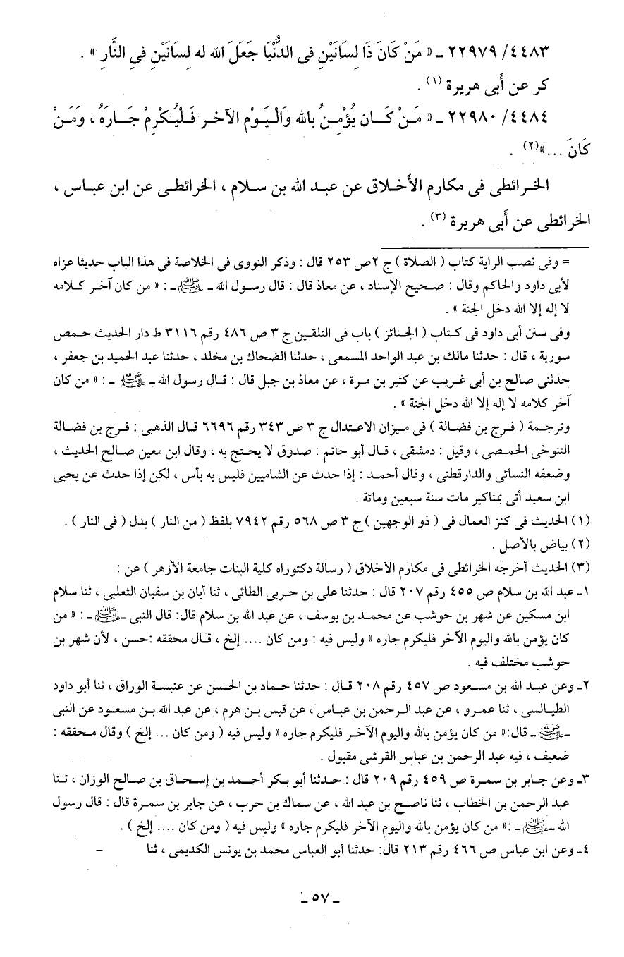 (¬3) الحديث أخرجه الخرائطي في مكارم الأخلاق (رسالة دكتوراه كلية البنات جامعة الأزهر) عن: