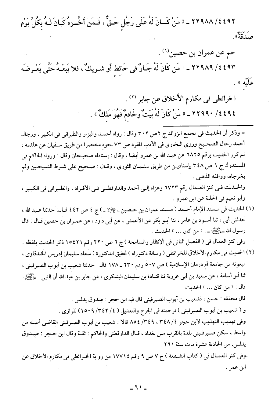 وفي كنز العمال في (كتاب الشفعة) ج 7 ص 9 رقم 17714 من رواية الخرائطي في مكارم الأخلاق عن ابن عمر.
