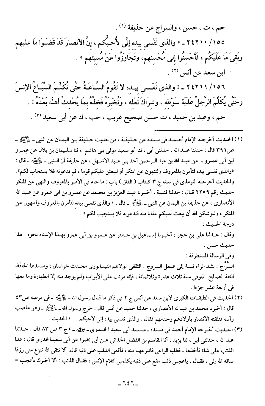 155/ 24210 - "والذِي نَفْسي بِيدِهِ إِنِّي لأُحِبُّكم، إِنَّ الأنصارَ قَدْ قَضَوْا مَا عليهم وبَقِيَ مَا عَلَيكُم، فَأَحْسِنُوا إِلى مُخسِنهم، وتَجَاوَزُوا عَنْ مُسِيِئهم".