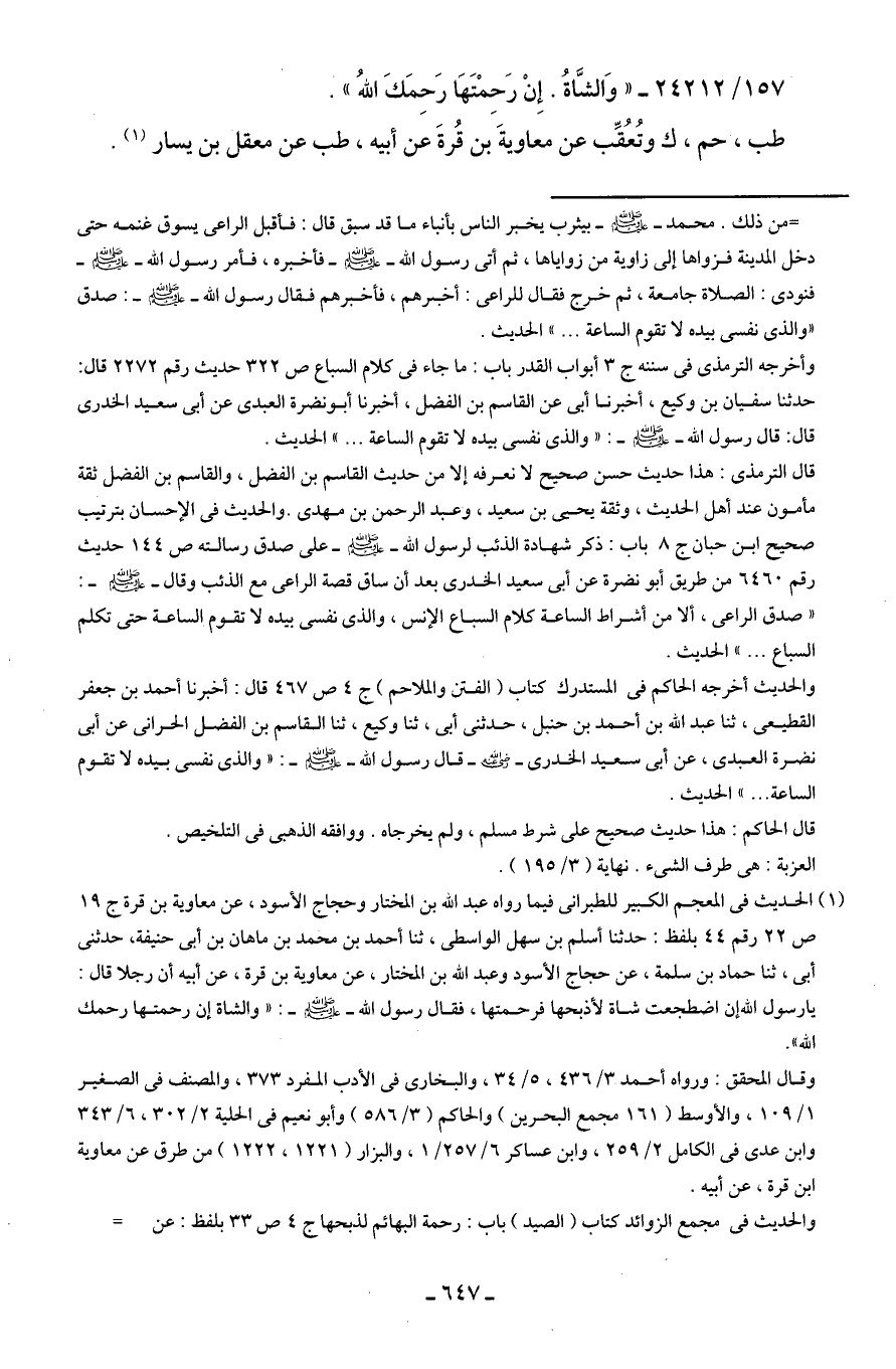 (¬1) الحديث في المعجم الكبير للطبراني فيما رواه عبد الله بن المختار وحجاج الأسود، عن معاوية بن قرة ج 19 ص 22 رقم 44 بلفظ: حدثنا أسلم بن سهل الواسطي، ثنا أحمد بن محمد بن ماهان بن أبي حنيفة، حدثني أبي، ثنا حماد بن سلمة، عن حجاج الأسود وعبد الله بن المختار، عن معاوية بن قرة، عن أبيه أن رجلا قال: يا رسول الله إن اضطجعت شاة لأذبحها فرحمتها، فقال رسول الله - صلى الله عليه وسلم -: "والشاة إن رحمتها رحمك الله".