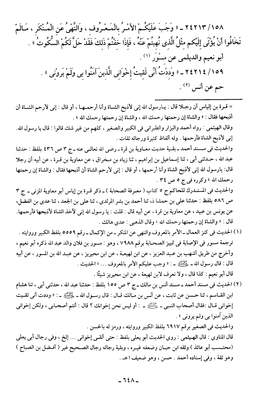 158/ 24213 - "وَجَبَ عَلَيكُمْ الأَمْرُ بِالْمَعْرُوفِ، وَالنَّهْيُ عَنِ الْمُنْكَرِ، مَا لَمْ تَخَافُوا أَنْ يُؤْتَى إِلَيكم مِثْلُ الَّذِي نُهِيتُمْ عَنْهُ، فَإِذَا خِفْتُمْ ذَلِكَ فَقَدْ حَلَّ لَكُمْ السُّكُوتُ".