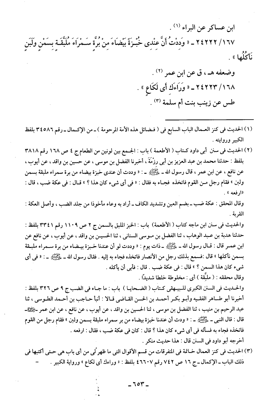 (¬2) الحديث في سنن أبي داود كتاب (الأطعمة) باب: الجمع بين لونين من الطعام ج 4 ص 168 رقم 3818 بلفظ: حدثنا محمد بن عبد العزيز بن أبي رِزْمَةَ، أخبرنا الفضل بن موسى، عن حسين بن واقد، عن أيوب، عن نافع، عن ابن عمر، قال رسول الله - صلى الله عليه وسلم -: "وددت أن عدى خبزة بيضاء من برة سمراء ملبقة بسمن ولبن" فقام رجل من القوم فاتخذه فجاء به فقال: "في أي شيء كان هذا؟ " قال: في عكة ضب، قال: "ارفعه".